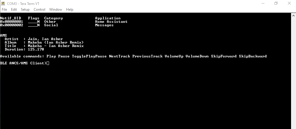 Once connected to a mobile device offering the ANCS/AMS Service, the application displays information about ANCS Notifications received from that device. This information is followed by the AMS track information (Artist, Album, Title, Duration in seconds). The application also displays the possible remote commands that the device state allows (such as Play, Pause, VolumeUp, VolumeDown). The notifications are received via ATT Notifications, for which the ANCS Client must register on the peer ANCS Server. The same must be done for the AMS server. It initially configures the information that it wants to be notified about. The application also retrieves and displays additional information about the received ANCS notifications. For this purpose, it writes commands to specified characteristics on the ANCS/AMS Server and receives responses via ATT Notifications from other characteristics. All information is displayed to the user using a shell available over a serial communications interface.