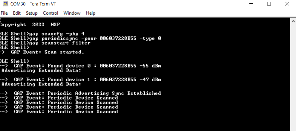Not all smartphones support extended advertising, hence a different method to view the AE beacon is to use the ble_shell application. In order to do this, perform the following steps: