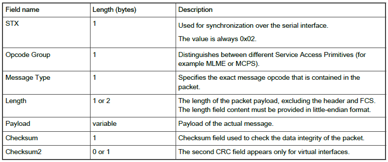 Support is provided for functionality at the MAC layer, for example, MAC/PHY layers of a stack are running as a Black Box on a board, and MAC higher layers are running on another. The higher layers send and receive serial commands to and from the MAC Black Box using the FSCI set of operation codes and groups.