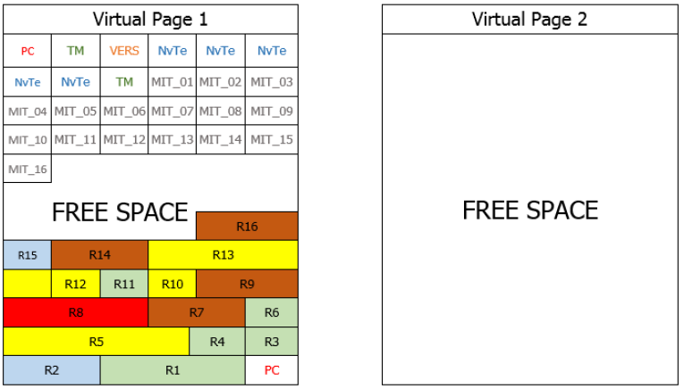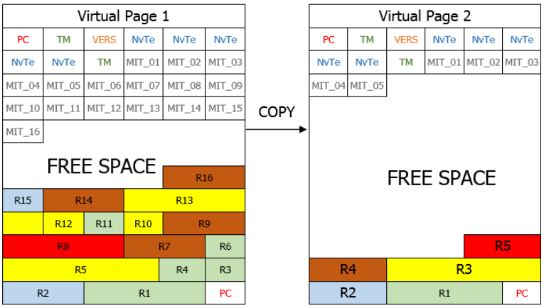In the example given below, the virtual page 1 is considered to be full if a new save request is pending and the page free space is not sufficient to copy the new record and the additional MIT. In this case, the latest saved datasets (table entries) are copied to virtual page 2.