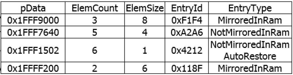 As show above, A NVM table entry contains a generic pointer to a contiguous RAM data structure, the number of elements the structure contains, the size of a single element, a table entry ID, and an entry type.