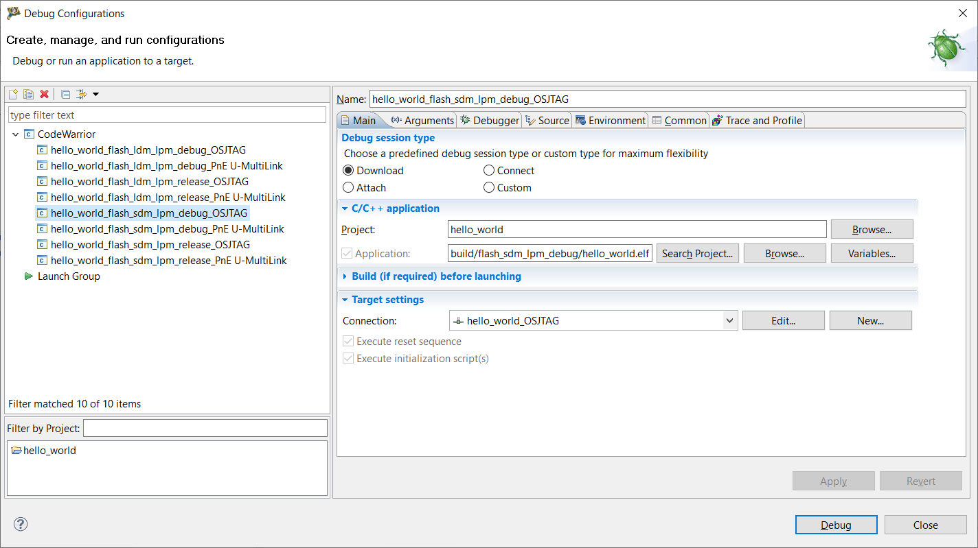 3. Select the desired build target from the drop-down menu. For this example, select hello_worldflash_sdm_lpm_debug