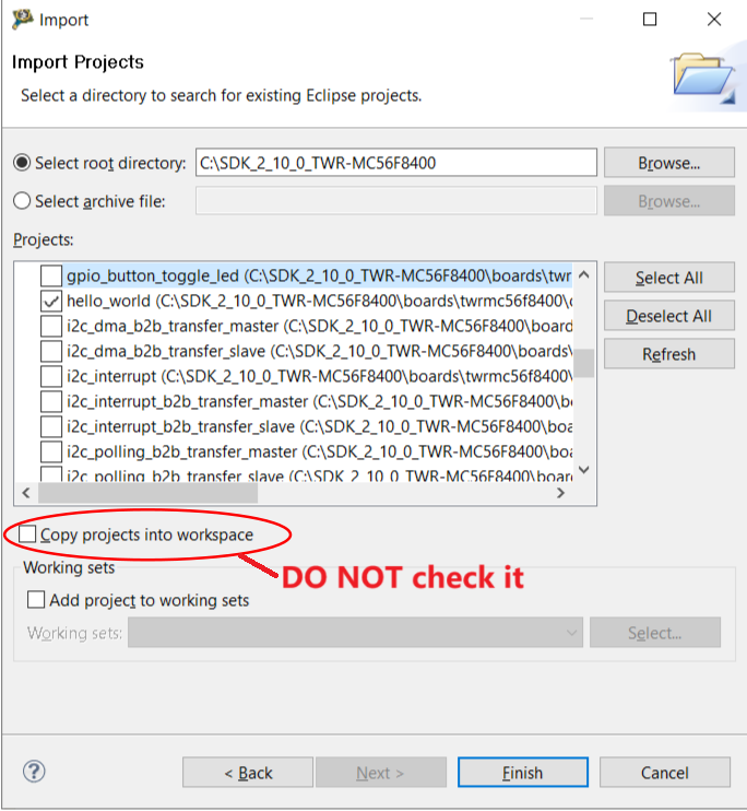 2. Import the project into the workspace. Click Import project in the Commander pane. A form pops up. Click Browse to the SDK install directory. Take TWR-MC56F8400 SDK as an example, all available demo projects are shown. Select the hello_world project in the list and click Finish.