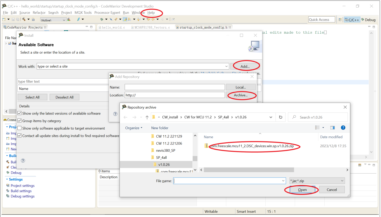 • Install ServicePack1 within CodeWarrior from the menu. Click the Help menu -> select Install new software -> Add -> Archive -> select the downloaded SP1 -> open -> check MCU v11.2 DSC Service Packs -> click Next.