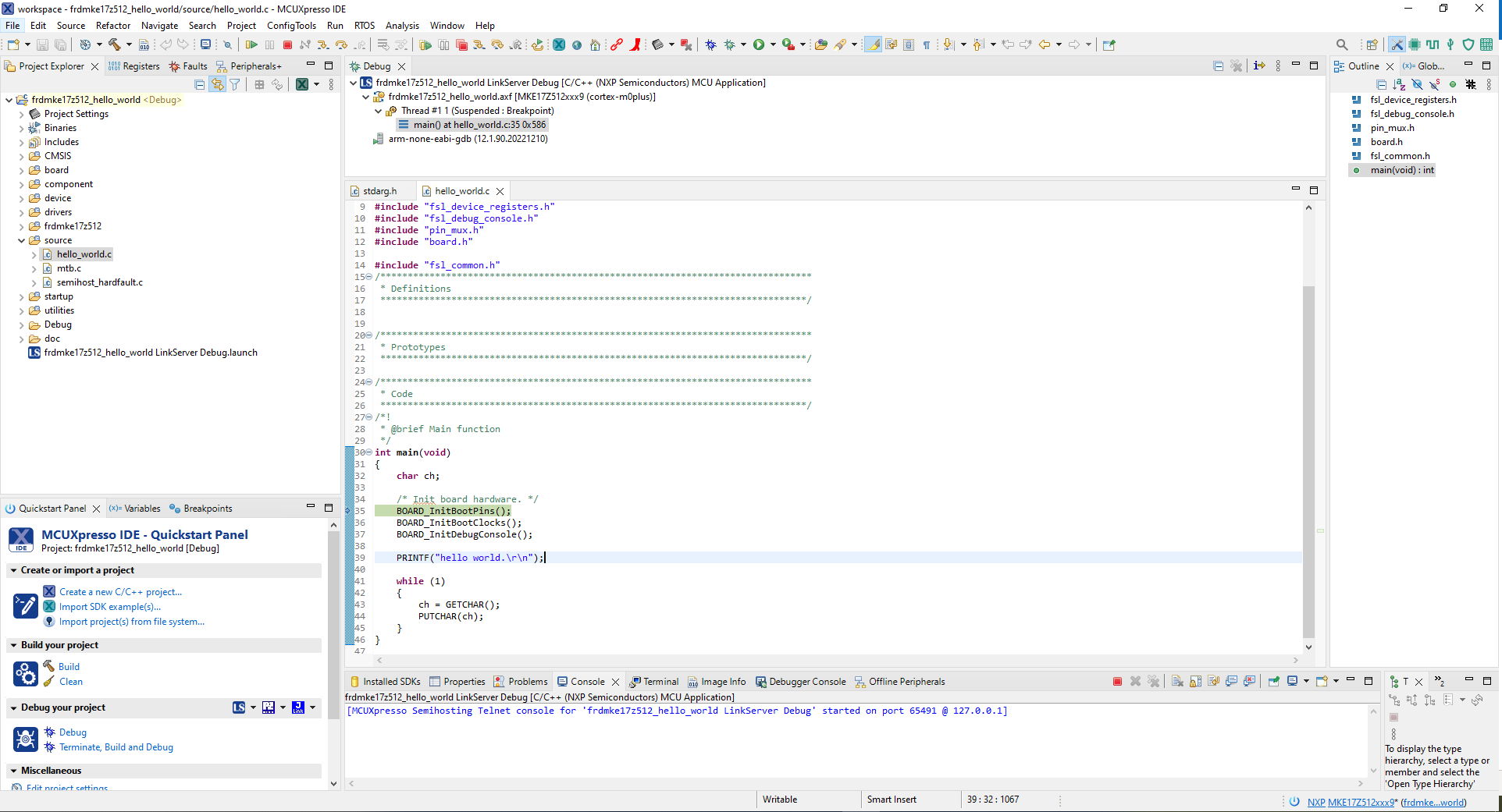 This section describes the steps required to configure MCUXpresso IDE to build, run, and debug example applications. The hello_world demo application targeted for the FRDM-KE17Z512 hardware platform is used as an example, though these steps can be applied to any example application in the MCUXpresso SDK.