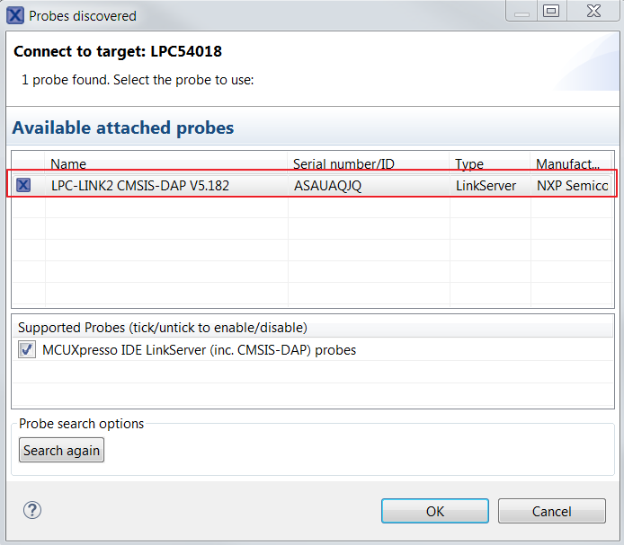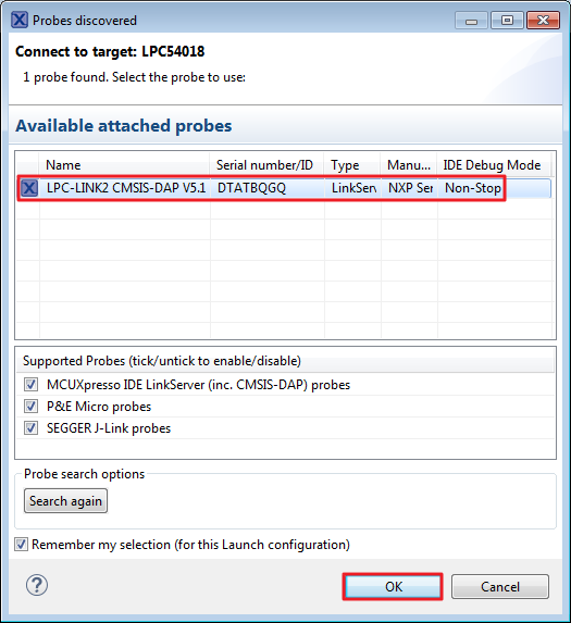 4. The first time you debug a project, the Debug Emulator Selection Dialog is displayed, showing all supported probes that are attached to your computer. Select the probe through which you want to debug and click the “OK” button. (For any future debug sessions, the stored probe selection is automatically used, unless the probe cannot be found.)