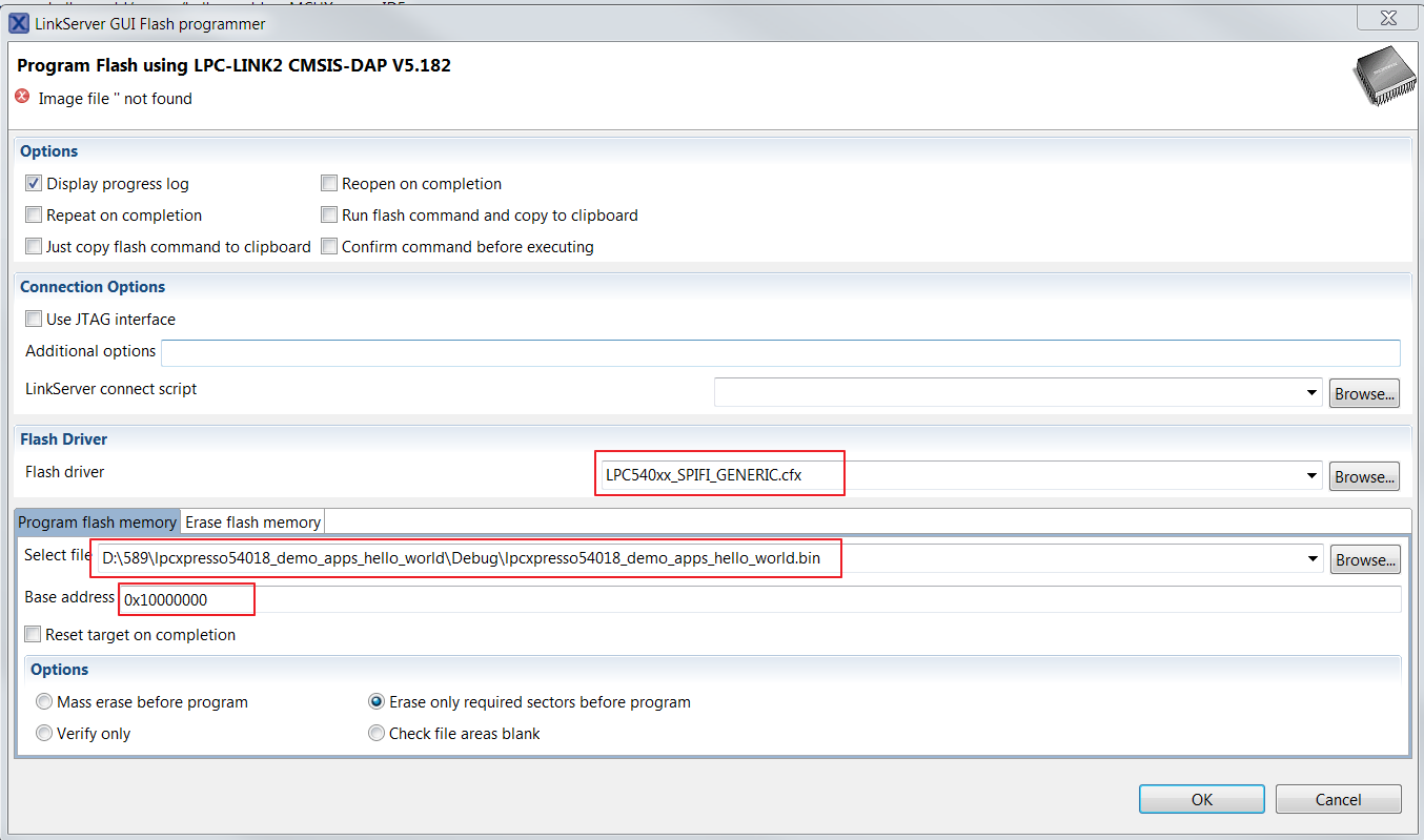 4. Select the flash driver, bin file, and external flash program address, then click the “OK” button to program the bin file to external flash.