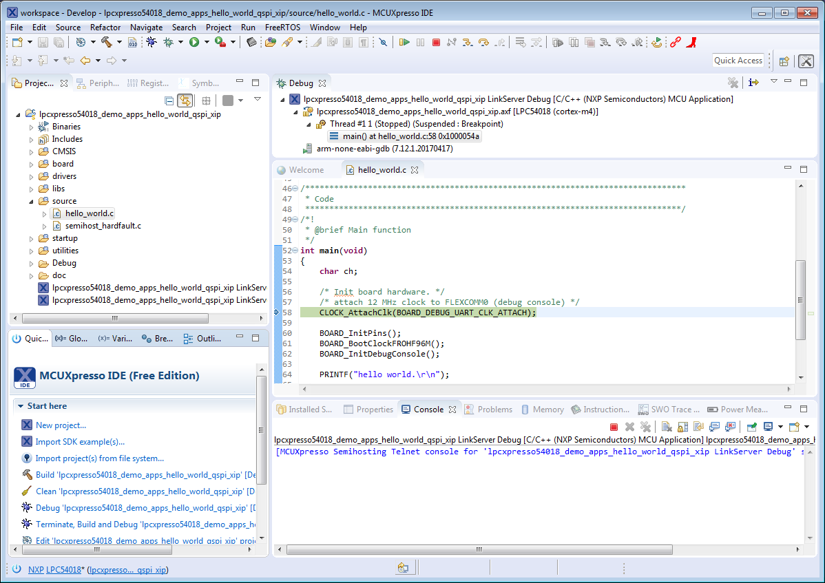 This section describes the steps required to configure MCUXpresso IDE to build, run, and debug example applications. The hello_world demo application targeted for the LPCXpresso54018 hardware platform is used as an example, though these steps can be applied to any example application in the MCUXpresso SDK.