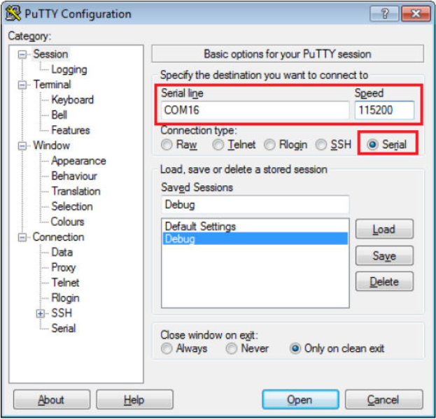 2. Open the terminal application on the PC, such as PuTTY or TeraTerm, and connect to the debug serial port number (to determine the COM port number, see Appendix A). Configure the terminal with these settings: