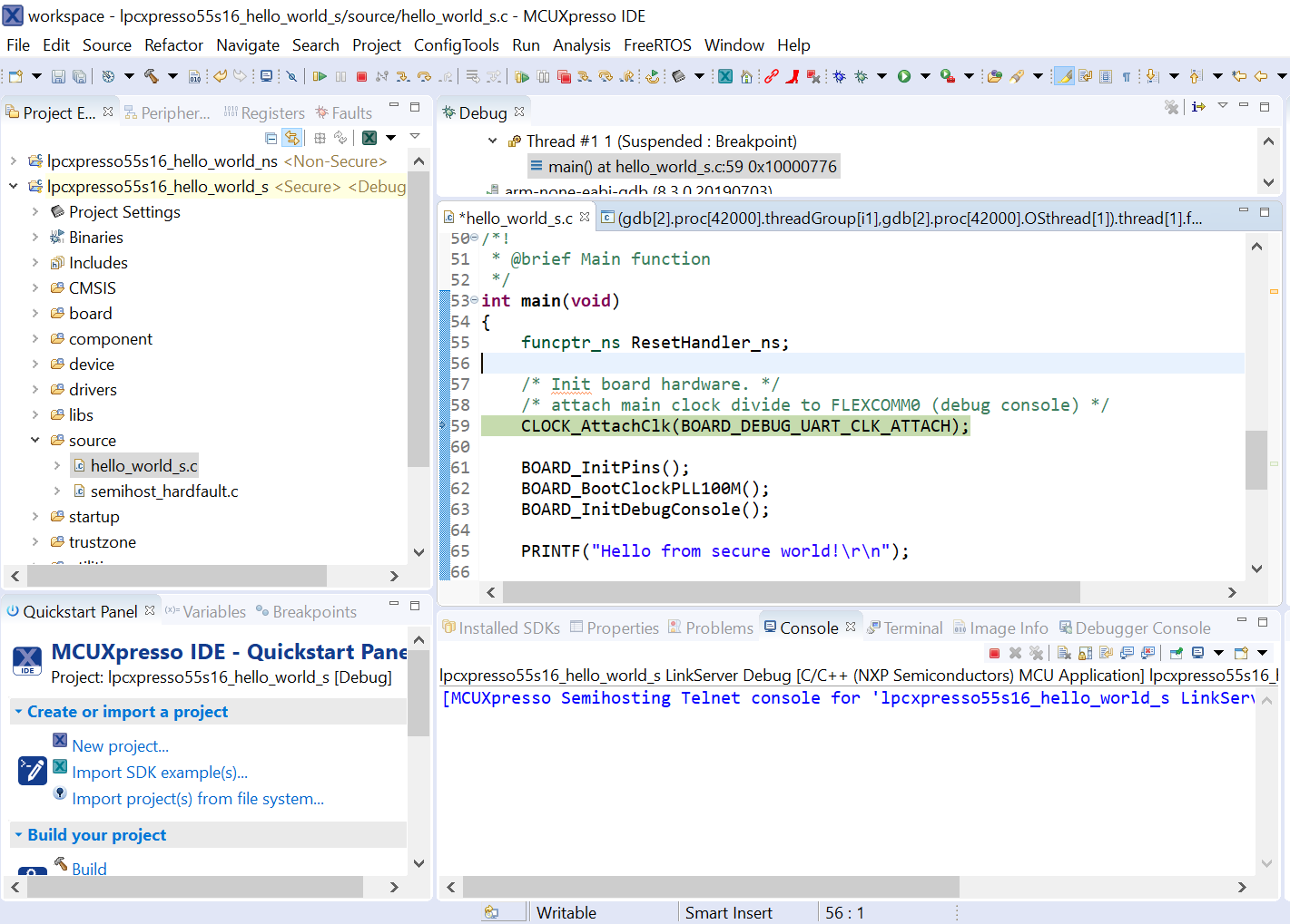 After loading the non-secure application, press RESET on board to release the device connect. Then, highlight the lpcxpresso55s16_trustzone_examples_hello_world_s project (TrustZone master project) in the Project Explorer. In the Quickstart Panel, click lpcxpresso55s16_trustzone_examples_hello_world_s [Debug] to launch the second debug session.