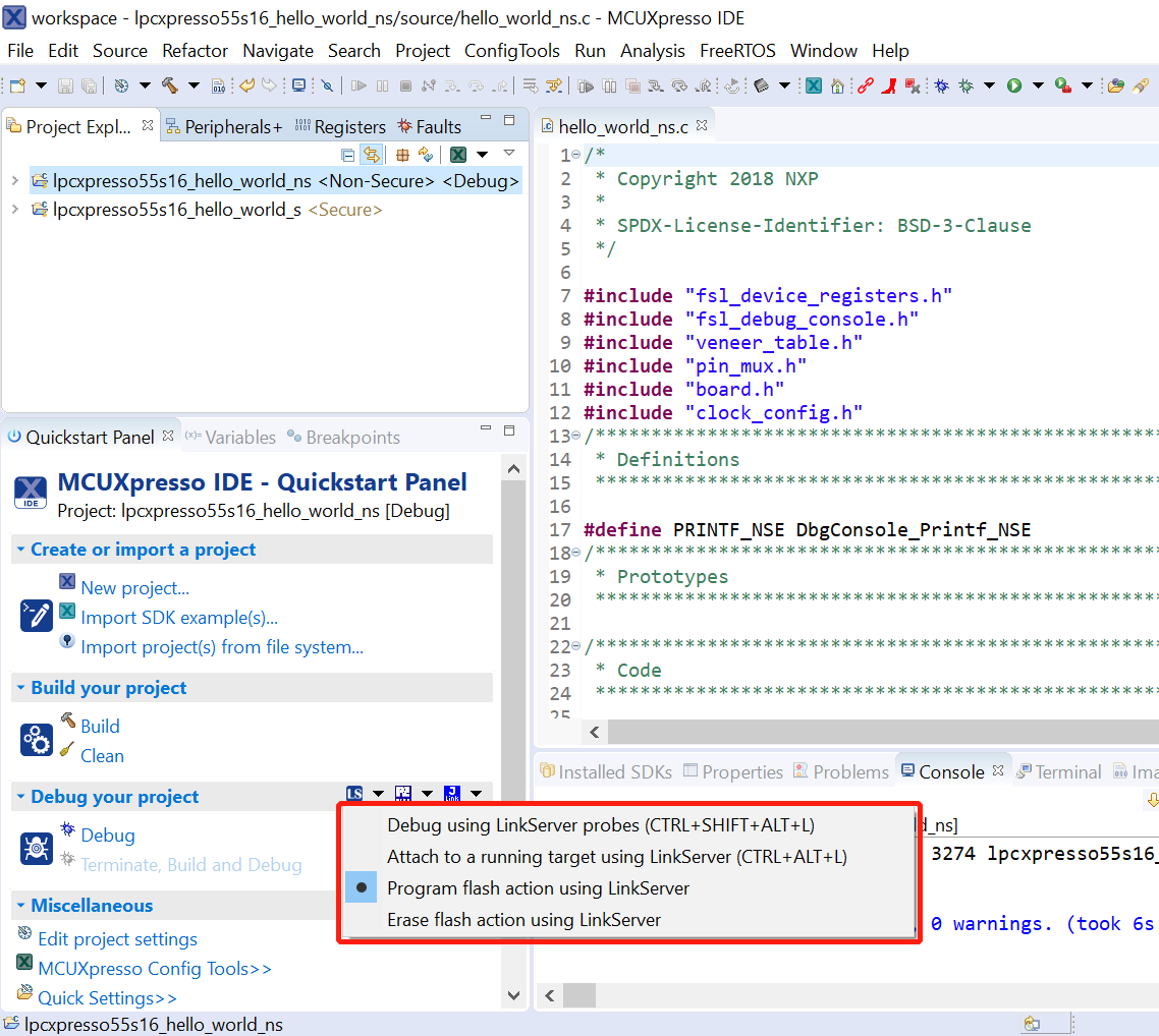This section describes the steps required to configure MCUXpresso IDE to build, run, and debug TrustZone example applications. The trustzone version of the hello_world example application targeted for the LPCXpresso55S16 hardware platform is used as an example, though these steps can be applied to any TrustZone example application in the MCUXpresso SDK.