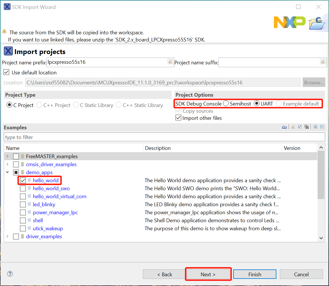 demo_appsfolder and selecthello_world. Then, select UART as SDK Debug Console andclick Next .