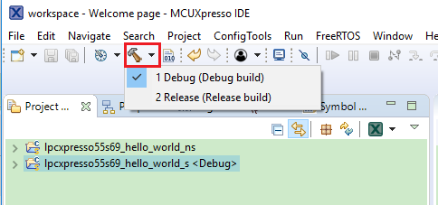 lpcxpresso55s16\_hello\_world\_sproject (TrustZone master project) in the Project Explorer. Then, choose the appropriate build target, Debug or Release, by clicking the downward facing arrow next to the hammer icon, as shown in Figure 3. For this example, select the Debug target.
