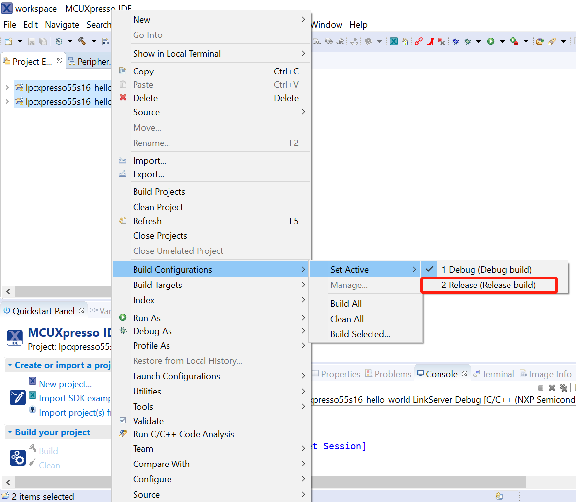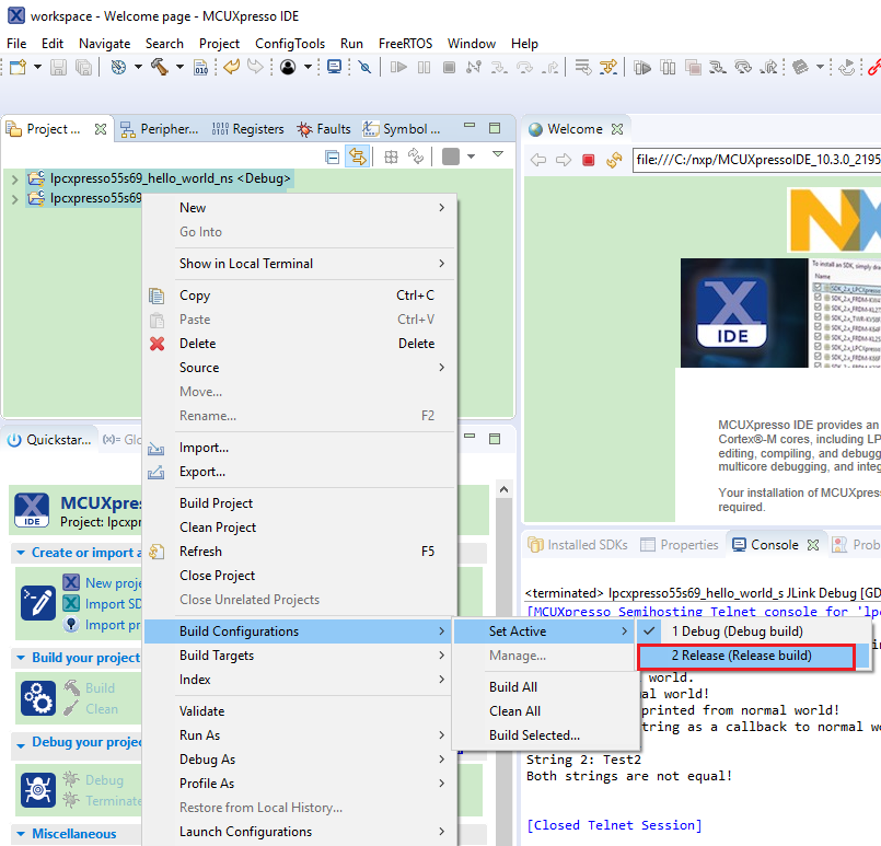 Note: When the Release build is requested, it is necessary to change the build configuration of both the secure and non-secure application projects first. To do this, select both projects in the Project Explorer view by clicking to select the first project, then using shift-click or control-click to select the second project. Right click in the Project Explorer view to display the context-sensitive menu and select Build Configurations > Set Active >Release. This is also possible by using the menu item of Project > Build Configuration >Set Active >Release. After switching to the Release build configuration. Build the application for the secure project first.