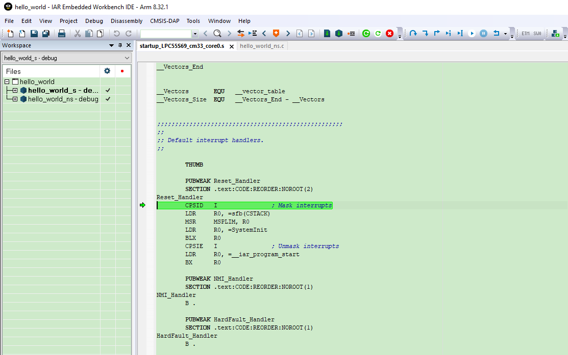Begin with a simple TrustZone version of the Hello World application. The TrustZone Hello World IAR workspaces are located in this folder: