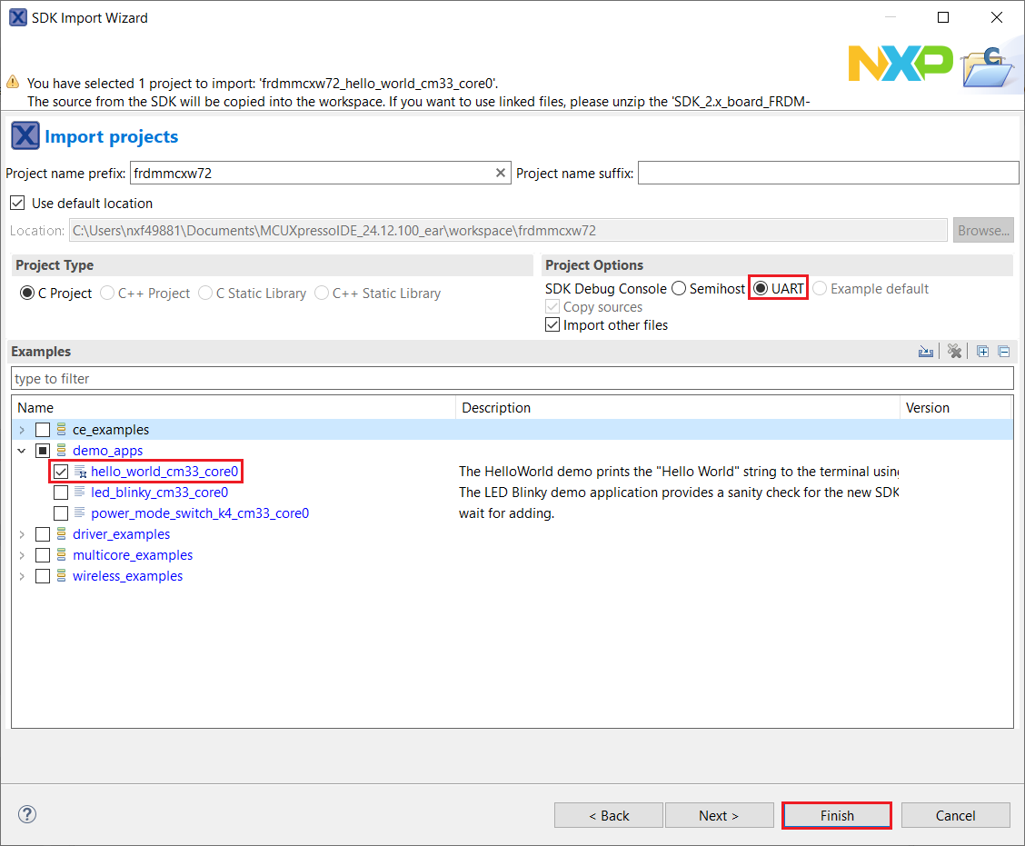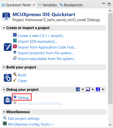 This section describes the steps required to configure MCUXpresso IDE to build, run, and debug example applications. The hello_world demo application targeted for the MCXW72X hardware platform is used as an example, though these steps can be applied to any example application in the MCUXpresso SDK.