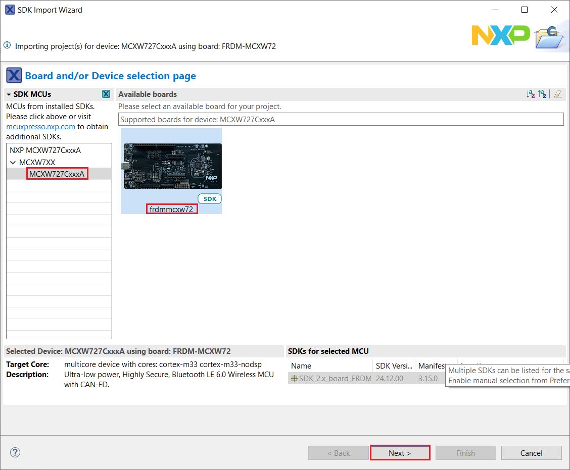 In the window that appears, expand the MCXW7XX folder and select MCXW726CxxxA. Then, select frdmmcxw72 and click Next.