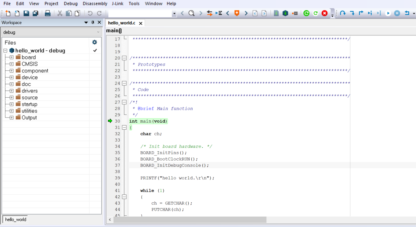 4. The application is then downloaded to the target and automatically runs to the main() function.