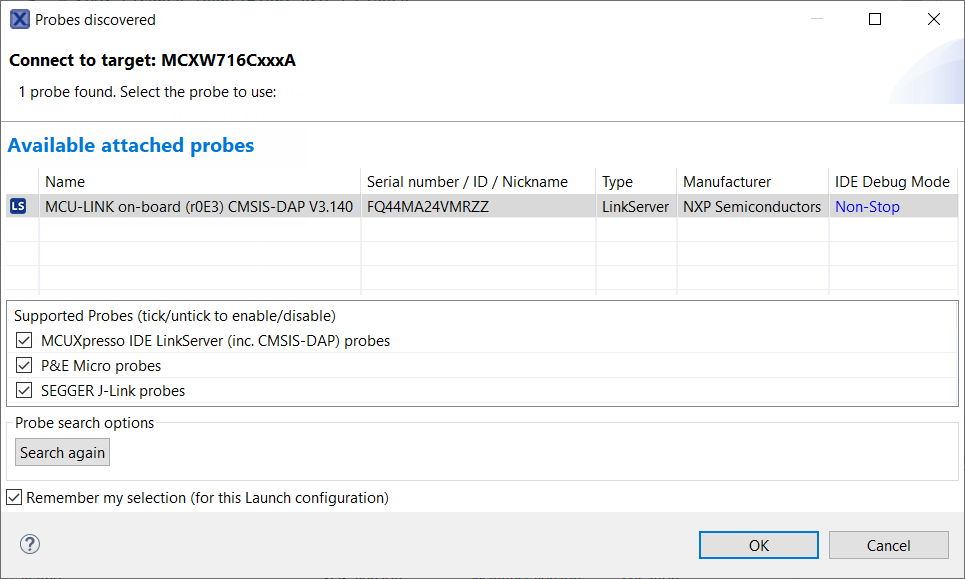 The first time you debug a project, the Debug Emulator Selection dialog is displayed, showing all supported probes that are attached to your computer. Select the probe through which you want to debug and click OK. (For any future debug sessions, the stored probe selection is automatically used, unless the probe cannot be found.)