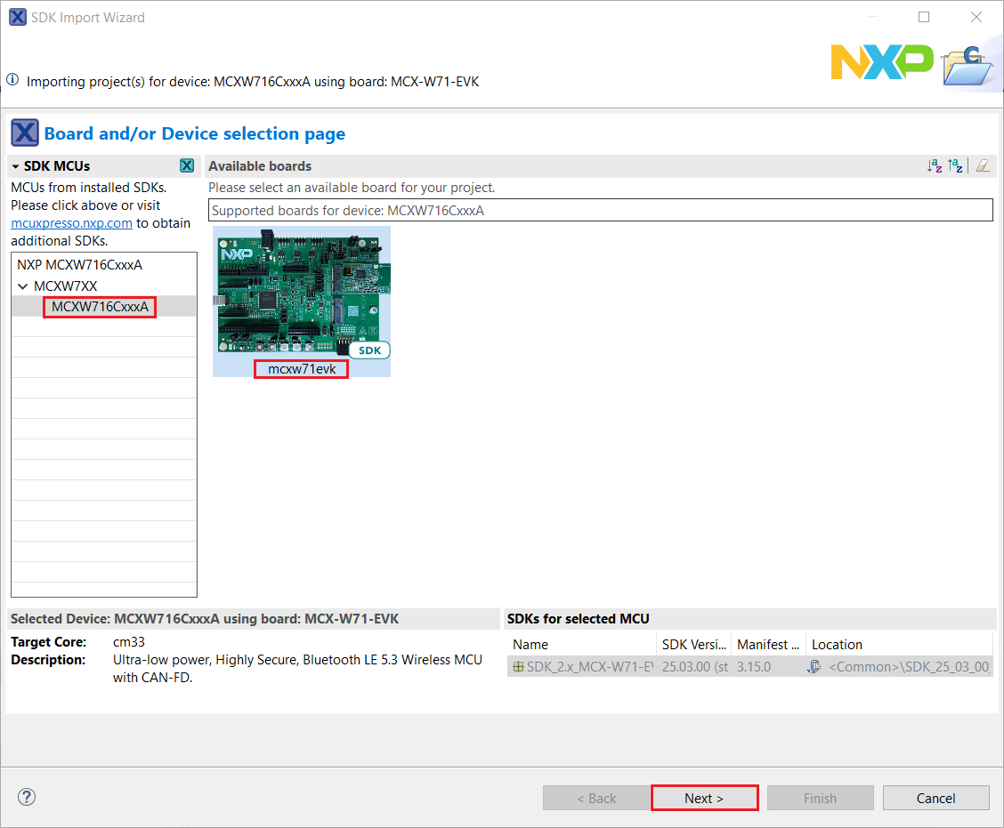 In the window that appears, expand the MCXW7XX folder and select MCXW716CxxxA. Then, select mcxw71evk and click Next.