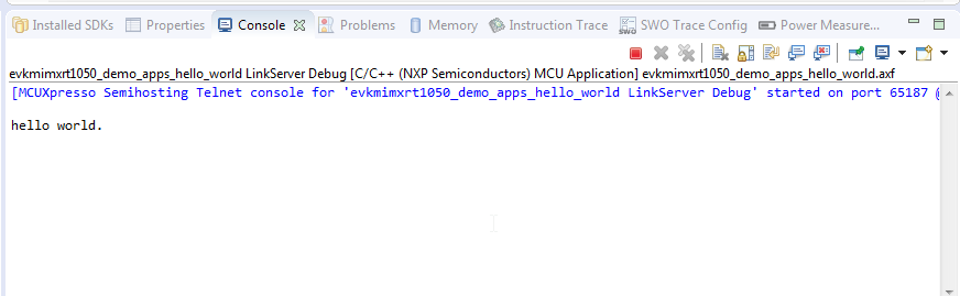 The hello_world application is now running and a banner is displayed on the MCUXpresso IDE console window. If this is not the case, check your terminal settings and connections.