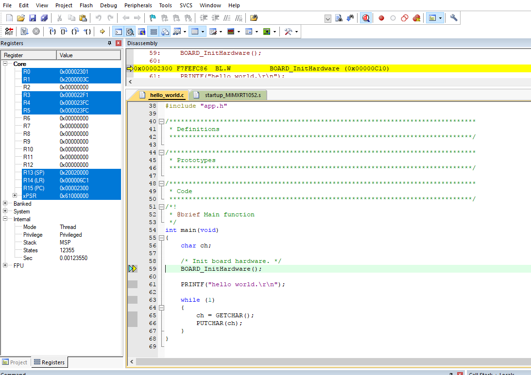 To debug the application, click load (or press the F8 key). Then, click the Start/Stop Debug Session button, highlighted in red in Figure 2. If using J-Link as the debugger, click Project option >Debug >Settings >Debug >Port, and select SW.
