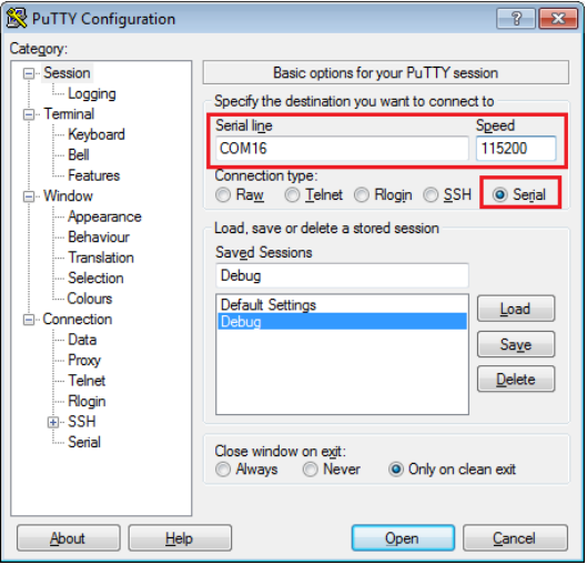 Open the terminal application on the PC, such as PuTTY or TeraTerm, and connect to the debug serial port number (to determine the COM port number, see How to determine COM port). Configure the terminal with these settings:
