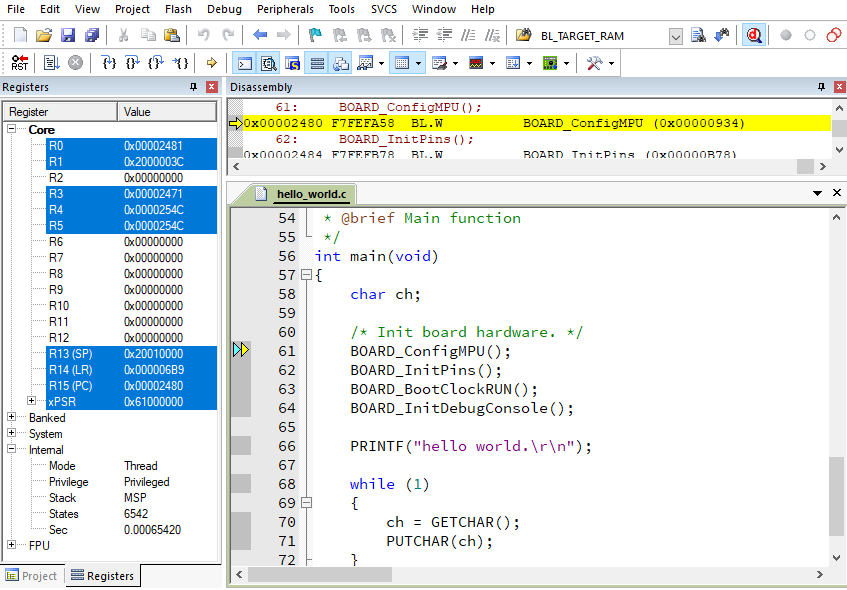 1. To debug the application, click load (or press the F8 key). Then, click the Start/Stop Debug Session button, highlighted in red in Figure 2. If using J-Link as the debugger, click Project option > Debug > Settings > Debug > Port, and select SW.