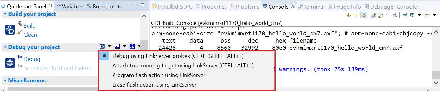 On the Quickstart Panel, click Debug ‘evkbmimxrt1170_demo_apps_hello_world’ [Debug].