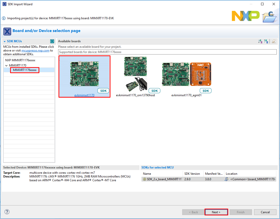 In the window that appears, select MIMXRT1176xxxxx. Then, select evkbmimxrt1170 and click Next.