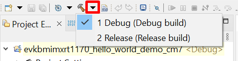hello_world_cm7project (multicore master project) in the Project Explorer. Then choose the appropriate build target, Debug or Release, by clicking the downward facing arrow next to the hammer icon, as shown in Figure 3. For this example, select Debug.