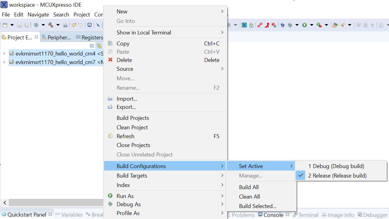 When the Release build is requested, it is necessary to change the build configuration of both the primary and auxiliary core application projects first. To do this, select both projects in the Project Explorer view and then right click which displays the context-sensitive menu. Select Build Configurations -> Set Active -> Release. This alternate navigation using the menu item is Project -> Build Configuration -> Set Active -> Release. After switching to the Release build configuration, the build of the multicore example can be started by triggering the primary core application (cm7)build.
