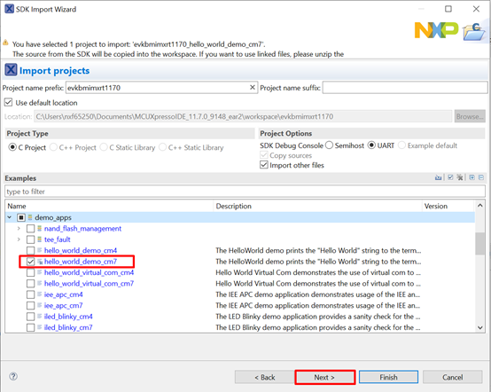 This section describes the steps required to configure MCUXpresso IDE to build, run, and debug example applications. The hello_world demo application targeted for the MIMXRT1170-EVKB hardware platform is used as an example, though these steps can be applied to any example application in the MCUXpresso SDK.