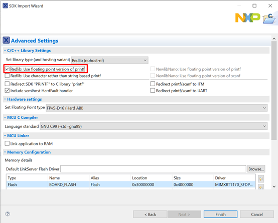 Ensure Redlib: Use floating point version of printf is selected if the example prints floating point numbers on the terminal for demo applications such as