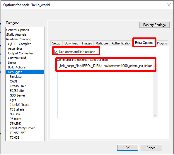 Note: The jlinkscript file is erquired for debugging sdram target with JLINK as probe. You must uncheck Use flash loader(s) and change the contents of the command-line options as : --jlink_script_file=$PROJ_DIR$/../evkcmimxrt1060_sdram_init.jlinkscript.
