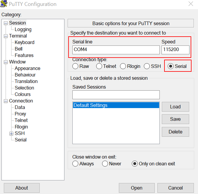 3. Open the terminal application on the PC, such as PuTTY or TeraTerm, and connect to the debug COM port (to determine the COM port number, see How to determine COM port). Configure the terminal with these settings: