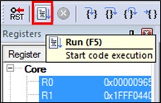 4. To debug the application, click load (or press the F8 key). Then, click the Start/ Stop Debug Session button, highlighted in red in Figure 2. If using J-Linkas the debugger, click Project option> Debug> Settings> Debug> Port, and select SW.
