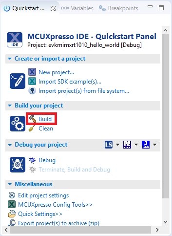 On the Quickstart Panel, click Debug evkmimxrt1010_demo_apps_hello_world [Debug].