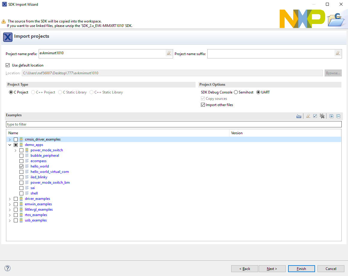 dac32_adc12,dac_adc,dac_cadc,ecompass,sai,coremark,mbedtls_benchmark,wolfssl_benchmark, and formmcau_examplessuch asmmcau_api). Otherwise, there is no need to select it. Click Finish.