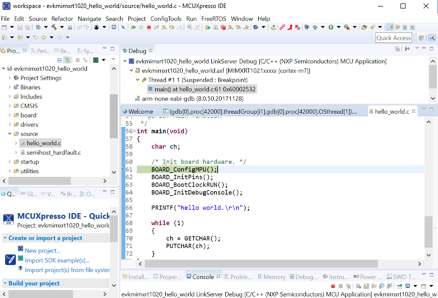 This section describes the steps required to configure MCUXpresso IDE to build, run, and debug example applications. The hello_world demo application targeted for the MIMXRT1024-EVK platform is used as an example, though these steps can be applied to any example application in the MCUXpresso SDK.