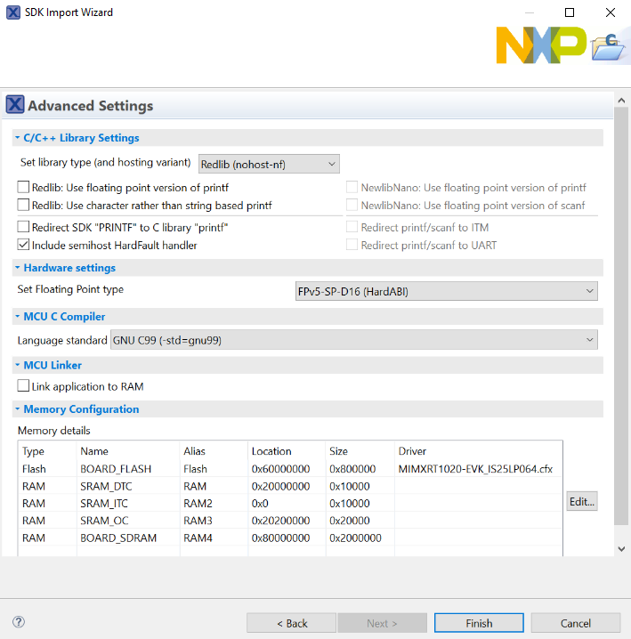 2. Ensure the option Redlib: Use floating-point version of printf is selected if the cases print floating-point numbers on the terminal (for demo applications such as dac32_adc12, dac_adc, dac_cadc, ecompass, sai, coremark, mbedtls_benchmark, wolfssl_benchmark, and for mmcau_examples such as mmcau_api). Otherwise, there is no need to select it. Click Finish.
