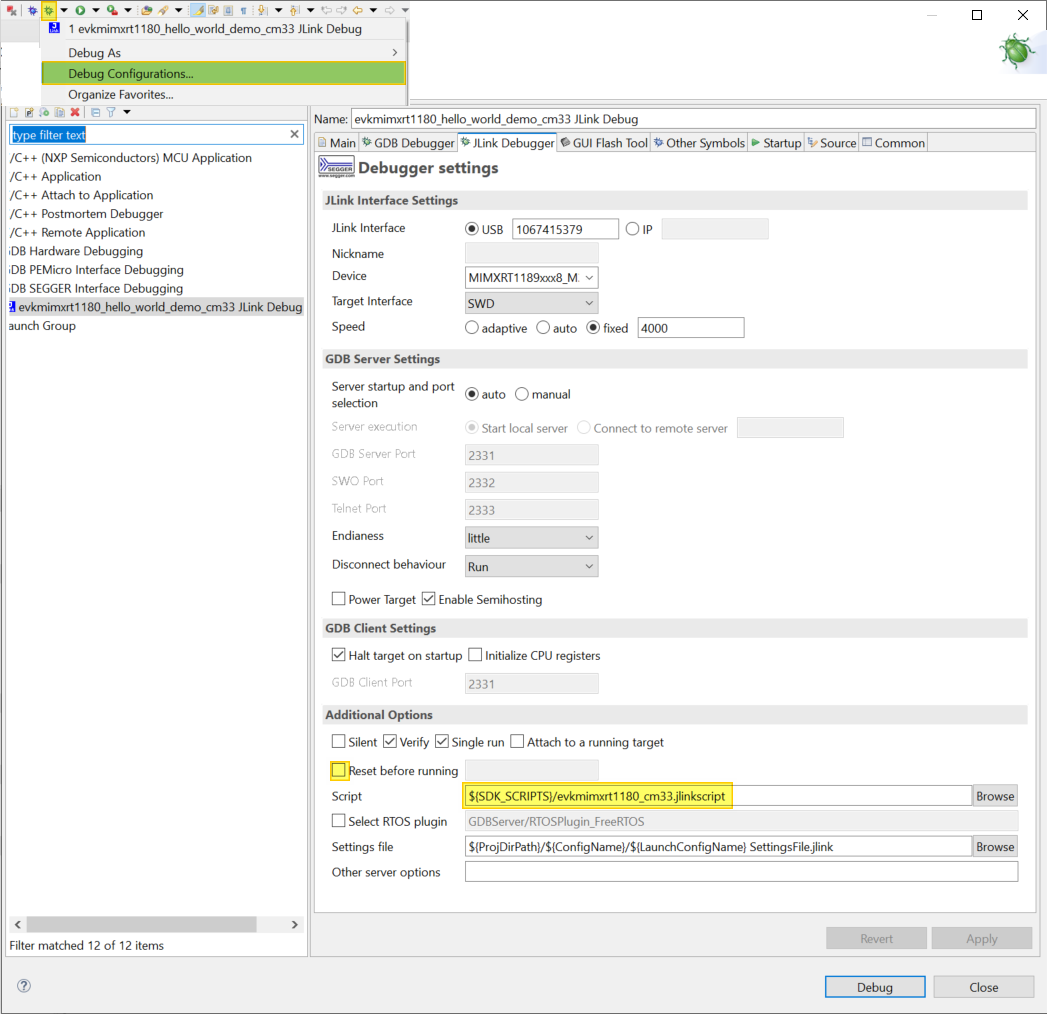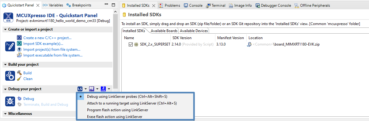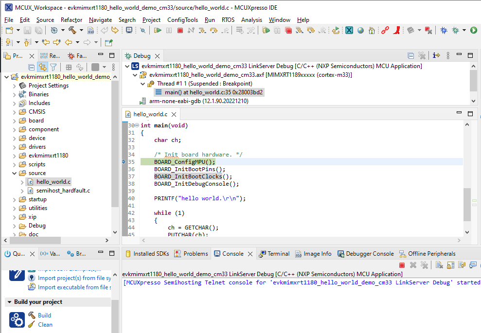This section describes the steps required to configure MCUXpresso IDE to build, run, and debug example applications. The hello_world demo application targeted for the MIMXRT1180-EVK hardware platform is used as an example, though these steps can be applied to any example application in the MCUXpresso SDK.