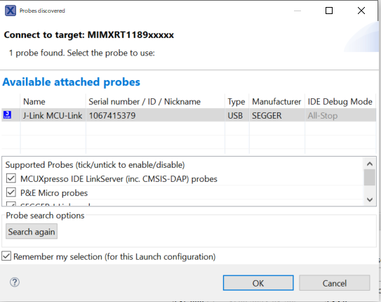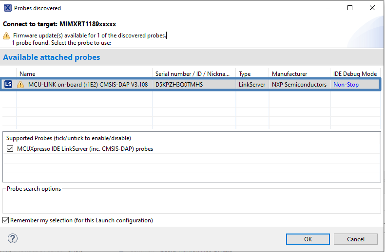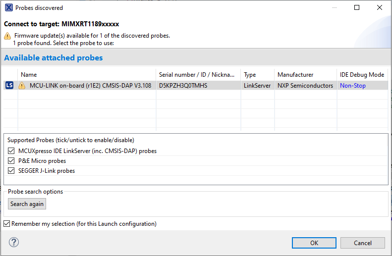 5. The first time you debug a project, the Debug Emulator Selection dialog is displayed, showing all supported probes that are attached to your computer. Select the probe through which you want to debug and click OK. Here we assume that you are using a CMSIS-DAP debug interface. (For any future debug sessions, the stored probe selection is automatically used, unless the probe cannot be found.)