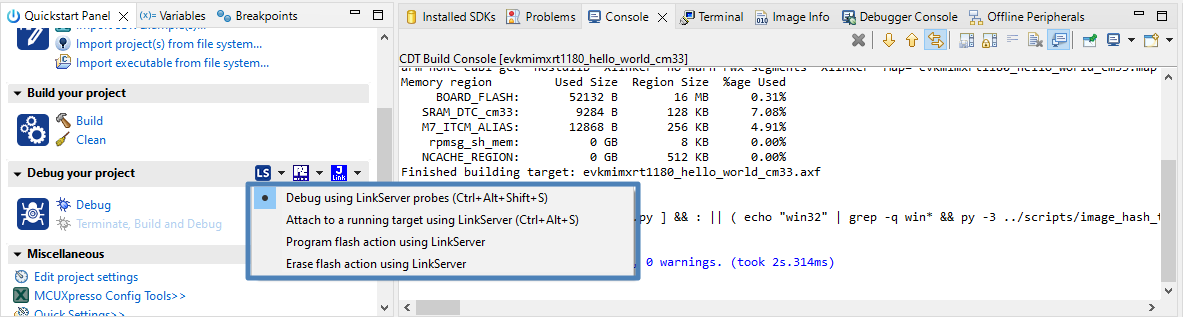 Note: Erase the flash memory before running the MCUX IDE projects for the first time. To do so, use the Erase Flash action using LinkServer in Figure 2 with SW5[1..4] on 0100. In the worst case when MCUX IDE cannot erase the flash, use the secure provisioning tool. For more information, see Use Secure Provisiong Tool to erase flash.