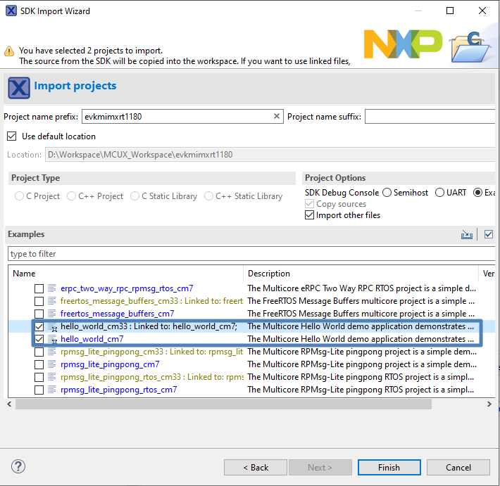 2. Expand the multicore_examples folder and select hello_world_cm33. The hello_world_cm7 counterpart project is automatically imported with the cm33 project, because the multicore examples are linked together and there is no need to select it explicitly. Click Finish.