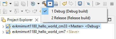 3. Now, two projects should be imported into the workspace. To start building the multicore application, highlight the hello_world_cm33 project (multicore master project) in the Project Explorer. Then choose the appropriate build target, Debug or Release, by clicking the downward facing arrow next to the hammer icon, as shown in Figure 3. For this example, select Debug.