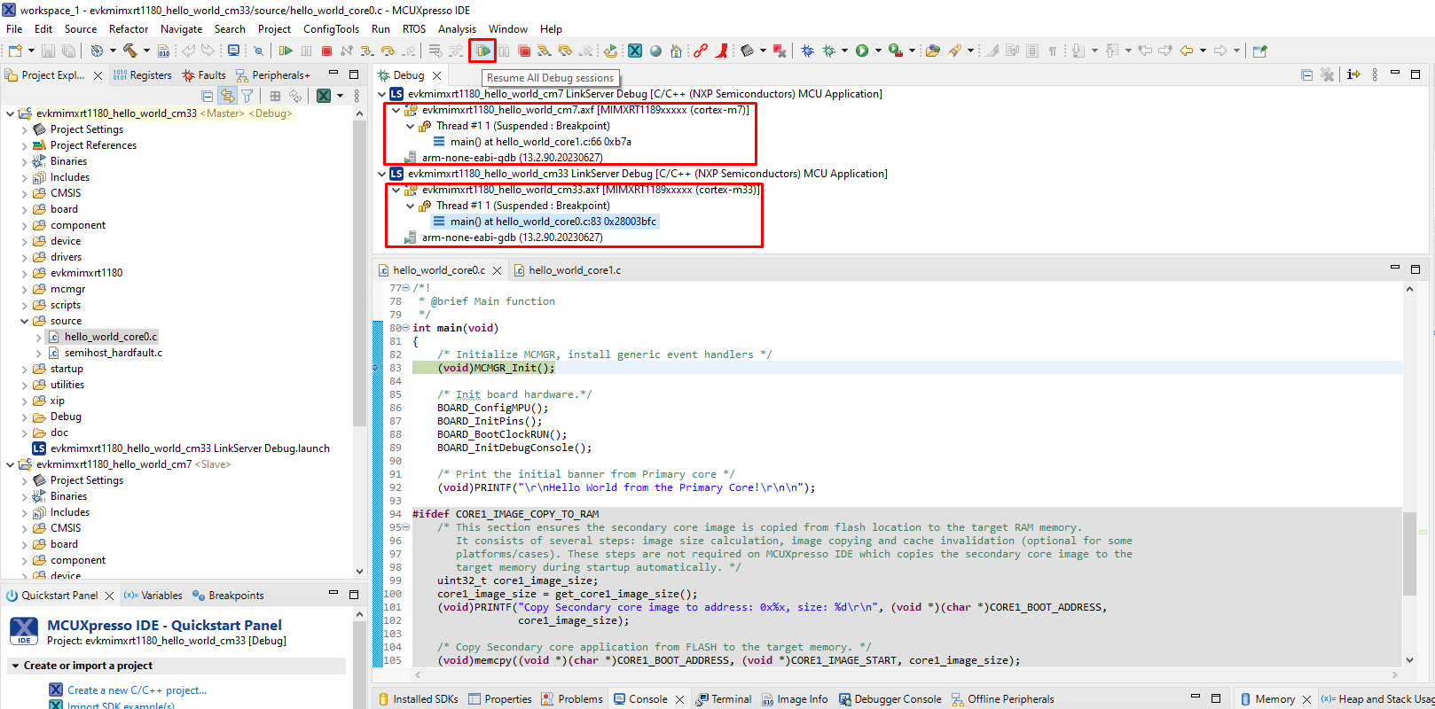 This section describes the steps required to configure MCUXpresso IDE to build, run, and debug multicore example applications. The following steps can be applied to any multicore example application in the MCUXpresso SDK. Here, the dual-core version of hello_world example application targeted for the evkmimxrt1180 hardware platform is used as an example.