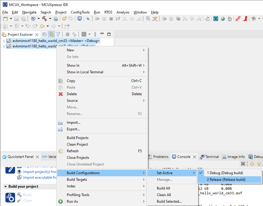 When the Release build is requested, it is necessary to change the build configuration of both the primary and auxiliary core application projects first. To do this, select both projects in the Project Explorer view and then right click which displays the context-sensitive menu. Select Build Configurations -> Set Active -> Release. This alternate navigation using the menu item is Project -> Build Configuration -> Set Active -> Release. After switching to the Release build configuration, the build of the multicore example can be started by triggering the primary core application (cm33) build.