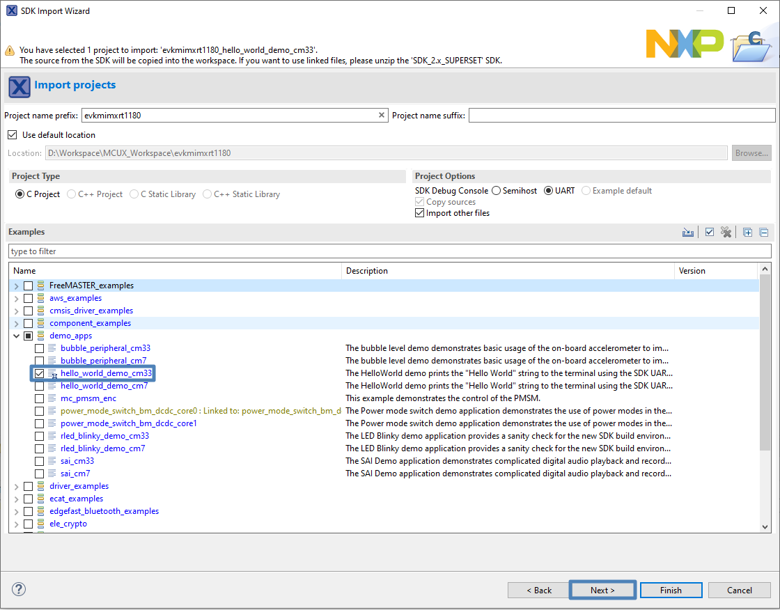 4. Expand the demo_apps folder and select hello_world_demo_cm33. Then, click Next.