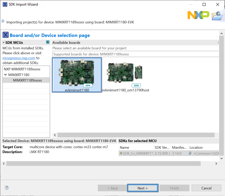 3. In the window that appears, select evkmimxrt1180 or kits and click Next.